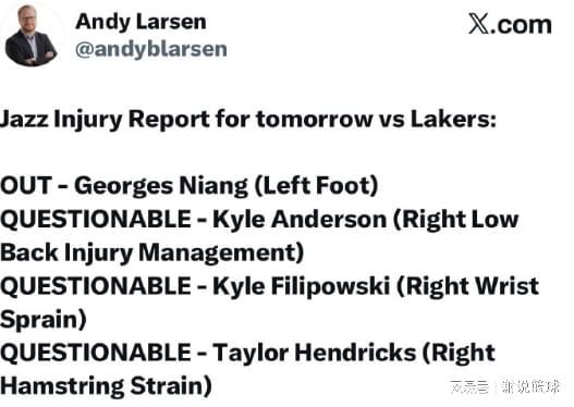 凭借最近两场胜利,湖人队已经巩固了西部前四的排名,从赛程来看,詹姆斯已经接近完成回归。所以只要阵容保持完整,湖人队就会很强。东契奇和里维斯的状态都很好。包括老詹姆斯在内,湖人队有三核心,至少地板确实很高。在湖人队主场迎战爵士队之前,情况看起来非常好。尤其是,根据ESPN官方的预测,湖人队的胜率接近90%,基本没有改变的机会。我们之所以如此看好湖人队,不仅是因为紫金军团的实力和地位,更是因为他们在主场的出色表现。另一方面,湖人队的对手可能有五名爵士球员缺席,这极大地限制了他们的实力,让湖人队占据了优势。事实上,爵士乐最近也发现自己处于类似的境地。年。他们每年都表现强劲,但随后由于伤病和球队定位的不确定性而开始大幅下滑。这个赛季也不例外。要知道爵士队目前排在西部第10位。他们仍然有机会赢得季后赛席位,击败快船队、太阳队和凯尔特人队。但爵士目前的伤病情况肯定有点严重,尤其是首发中锋沃克·凯斯勒。据传他与湖人队有联系。本赛季凯斯勒继续进步,场均贡献14.4分10.8篮板3助攻1.4抢断1.8盖帽。他的远距离投篮能力也得到了发展,三分球命中率超过70%。虽然整体样本较小,但足以说明Kes进步者的速度。不过,他总共只出场了五场比赛,就因伤提前退役。此外,重返爵士队的乔治·尼昂也因伤无法出战。哟你可能知道尼昂在新秀赛季曾短暂效力于步行者队,然后成为爵士队的一员。尼昂随后继续为骑士队和老鹰队等球队效力。今年夏天他回到盐湖城。不过,他因伤尚未上场。爵士目前仍有三名球员出战成疑:菲利波夫斯基、亨德里克斯和凯尔·李。前两项对于爵士队的锋线轮换极为重要。他在爵士首场对阵快船的比赛中给人们留下了深刻的印象。至于中国球迷更为熟悉的凯尔·李,他在场上对爵士队来说似乎并不那么重要。最终,除了凯尔·李在对阵黄蜂队的比赛中得到5分和2次助攻外,他在剩下的比赛中都在场边休息。