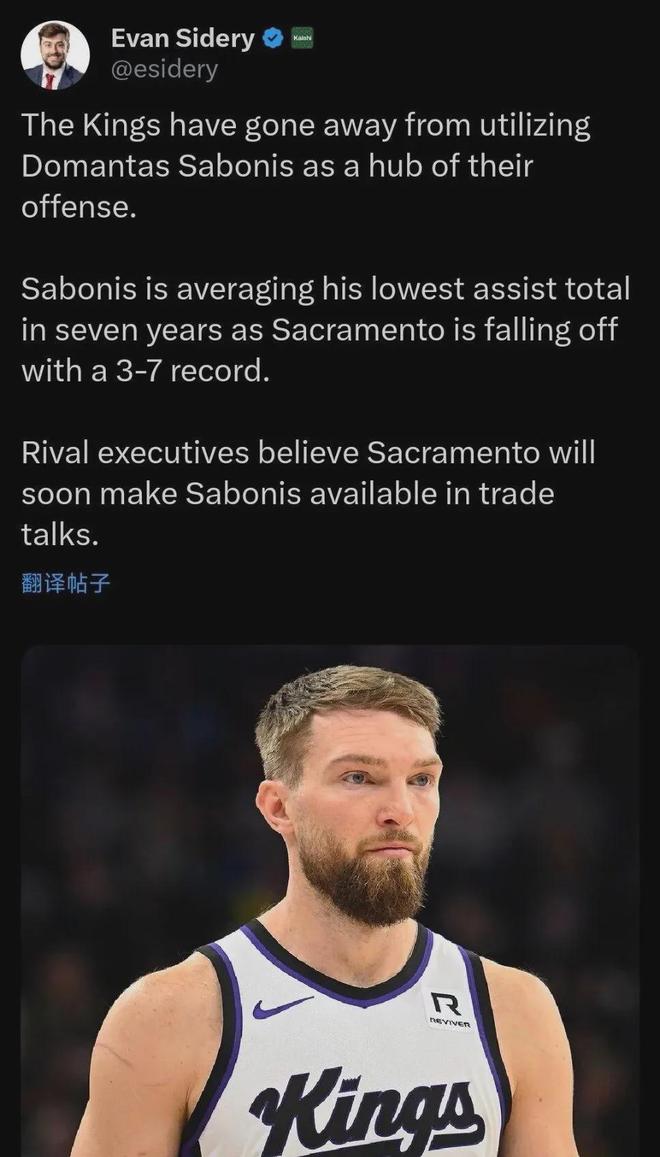 著名记者赛德利:国王队很快就会把萨博尼斯摆上交易架……萨博尼斯出生于1996年5月3日,是一名身高2.08米的内线球员。他在第16届首轮第11位被选中。他三次入选全明星,三次当选篮板王,两次入选NBA最佳阵容第三队。在他最好的赛季(23-24),他场均得到19.4分、13.7个篮板和8.2次助攻。然而,萨博尼斯本赛季的进攻效率直线下降。到目前为止,他场均贡献15.3分、14个篮板、3.9次助攻和1.1次抢断。他的三分命中率分别为47.7%、15.4%和74.2%。他的投篮命中率是自新秀赛季以来最低的(39.9%)。结果,国王队正在慢慢失去进攻中锋的角色。与此同时,您还面临着在未发挥真正潜力的情况下被出售的风险。有热心网友要求勇士队到时候采取行动:这家伙正在服的合同2028年夏天到期,本赛季他的工资为4234万美元,接下来两个赛季的工资总额为9408万美元。虽然价格并不算太贵,但绝对不是勇士能够轻易承受的金额。他2025-26赛季的年薪总额为2.485亿美元,排名联盟第一,薪资空间为9383万美元,排名联盟倒数第二。萨博尼斯、约基奇和申金被称为当今NBA最强大的三位中锋,代表了高水平比赛中的整体智慧。然而,第一个不像后两个那样通用。主要原因是他们没能获得稳定的远距离投篮能力。职业生涯至今,他场均只有0.5个三分球,命中率只有34.4%,因此在进攻端经常打不出爆发性的成绩。也就是说,萨博尼斯这样的大个子,很少投篮,也拉不开空间,不太适合勇士队。例如,效力于金州勇士队的两名内线球员梦想格林本赛季至今场均贡献1.8个篮板。 29岁的萨博尼斯的未来在哪里?让我们拭目以待吧!